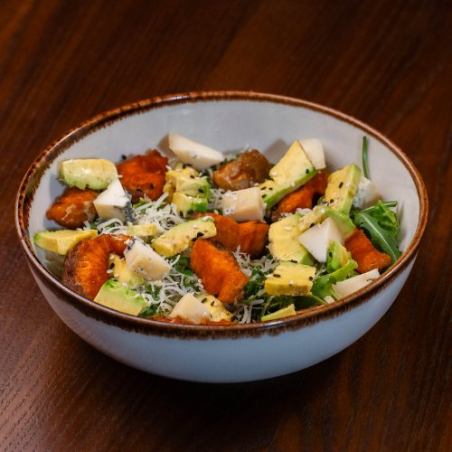 Микс-салат, дор-блю, авокадо, пармезан, форель, бальзамический соус, кунжут, заправка.