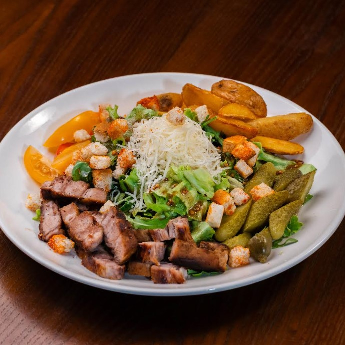 Заказать Микс-салат, свинина жареная, корнишоны, томаты черри, картофельные дольки, сыр пармезан, крутоны, заправка.