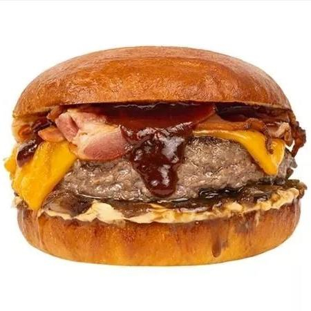 Заказать Булочка, двойная говяжья котлета, соус барбекю, сыр чеддер, хрустящий бекон, карамельный лук.