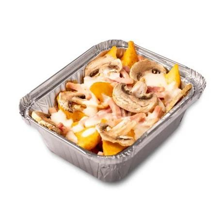 Заказать Запеченные дольки картофеля, ветчина, шампиньоны, сыр моцарелла, соус чесночный рэнч.