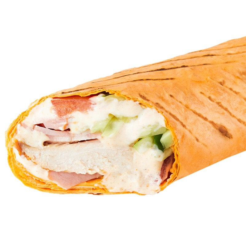 Заказать Курица, лаваш, бекон, томаты, соус сырно-чесночный, лук репчатый, оригинальный соус на основе домашнего майонеза, чеснока, дижонской горчицы и кефира.