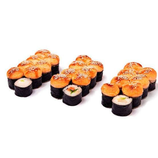 Мини ролл Королевская креветка, мини ролл Лосось, мини ролл Мидия, мини ролл Снежный краб, мини ролл Огурец, мини ролл Курочка, мини ролл кремчиз. Запеченные под фирменным соусом с сыром Моцарелла и полито соусом унаги.