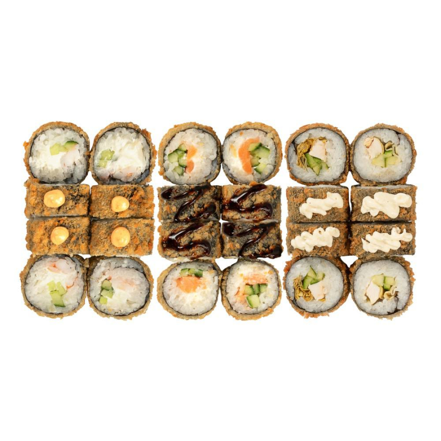 Заказать Мини ролл Королевская креветка, мини ролл Лосось, мини ролл Мидия, мини ролл Снежный краб, мини ролл Огурец, мини ролл Курочка, мини ролл кремчиз. Запеченные под фирменным соусом с сыром Моцарелла и полито соусом унаги.