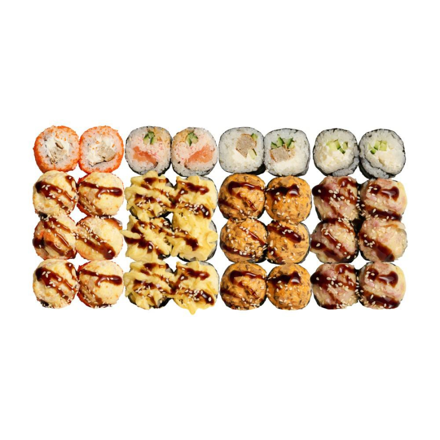 Заказать Мини ролл Королевская креветка, мини ролл Лосось, мини ролл Мидия, мини ролл Снежный краб, мини ролл Огурец, мини ролл Курочка, мини ролл кремчиз. Запеченные под фирменным соусом с сыром Моцарелла и полито соусом унаги.