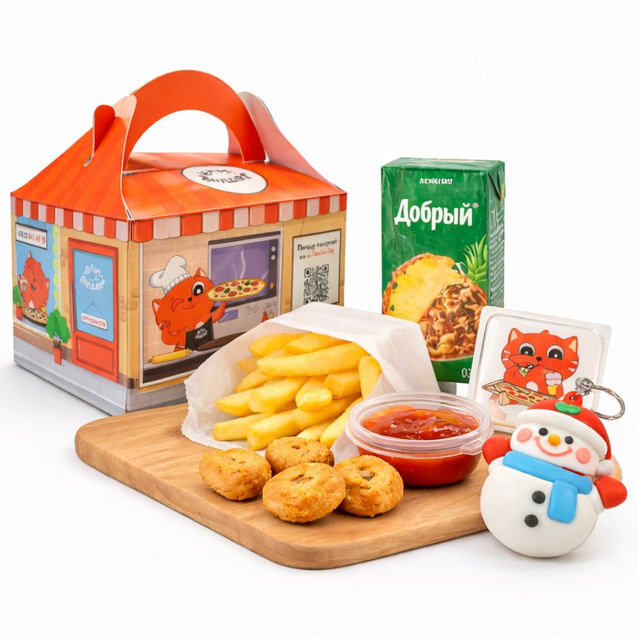 Фри 60г, кетчуп, сок, игрушка, 3D наклейка фирменная, наггетсы 4шт.