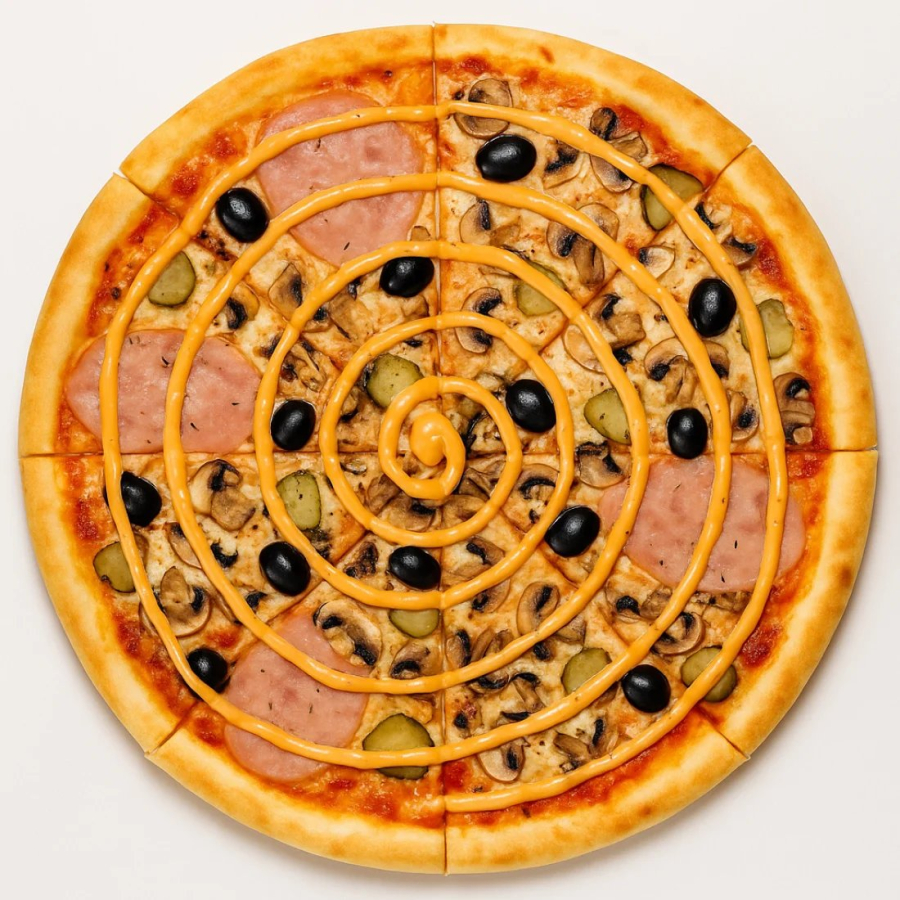 Ветчина, шампиньоны, маслины, маринованные огурчики, сырный соус, моцарелла, томатный соус, масло чесночное.