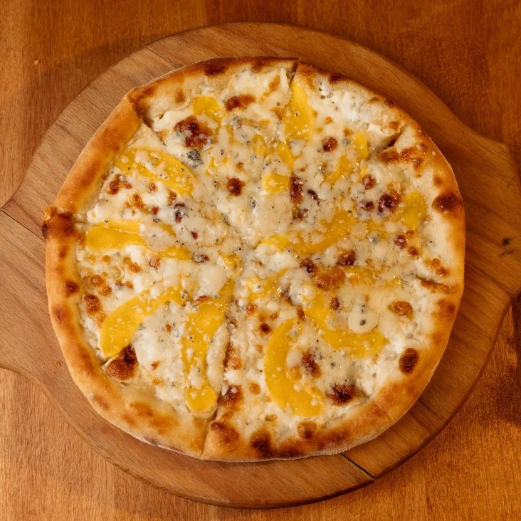 Заказать Мягкое тесто, сливочный соус, 100% Моцарелла, сыр с голубой плесенью, персик, масло чесночное.