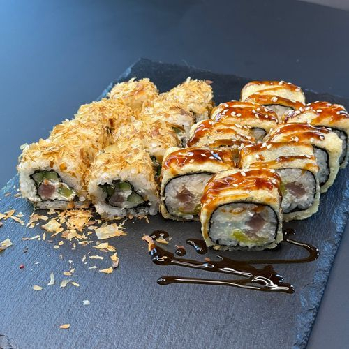 Ролл Запечённый Дикий тунец с крем-сыром, тунцом, кунжутом и аппетитной шапочкой для запекания. Ролл Темпура с копчёной курицей — оригинальное сочетание курицы, сладкого персика и соуса терияки. Ролл Темпура с тунцом и такуаном — копчёный тунец, маринованный такуан и золотистая панировка. Фирменный соевый соус в комплекте делает вкус роллов ещё насыщеннее.