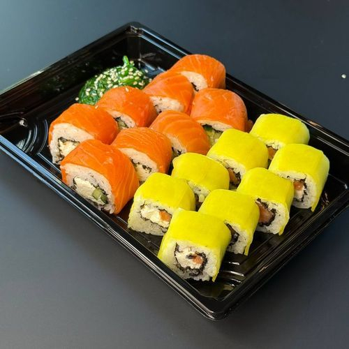 Ролл Филадельфия — рис, нори, сливочный сыр, слабосолёная форель и свежий огурец. Ролл Дайкон — нежная форель, крем-сыр и хрустящий маринованный такуан. Дополняют сет свежий салат чука, ароматный кунжут и фирменный соевый соус. Идеальный выбор для лёгкого ужина, романтической встречи или угощения на компанию.