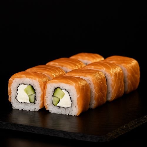 Нежный сыр крем-чиз, свежий огурец и ароматная слабосолёная форель создают идеальное сочетание вкусов. Лёгкий рис и нори подчёркивают гармонию начинки, делая этот ролл универсальным выбором для ужина, вечеринки или корпоративного заказа.