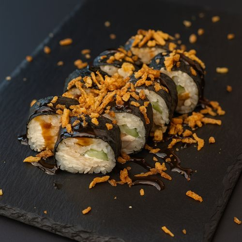 Это классика японской кухни в новом исполнении. Внутри — мягкий рис, нори, сливочный сыр крем-чиз, свежий огурец и ароматный копчёный тунец. Снаружи ролл украшен нежной стружкой тунца, которая делает вкус насыщенным и необычным.