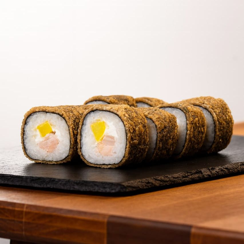 Это необычное сочетание копчёного мяса, сладкого персика и сливочного сыра. Хрустящая панировка темпуры, золотистые сухари и кунжут придают роллу аппетитный вид и насыщенный вкус, а соус терияки добавляет яркий сладко-солёный акцент. Такой ролл идеально подойдёт для тех, кто любит сытные и оригинальные блюда японской кухни.