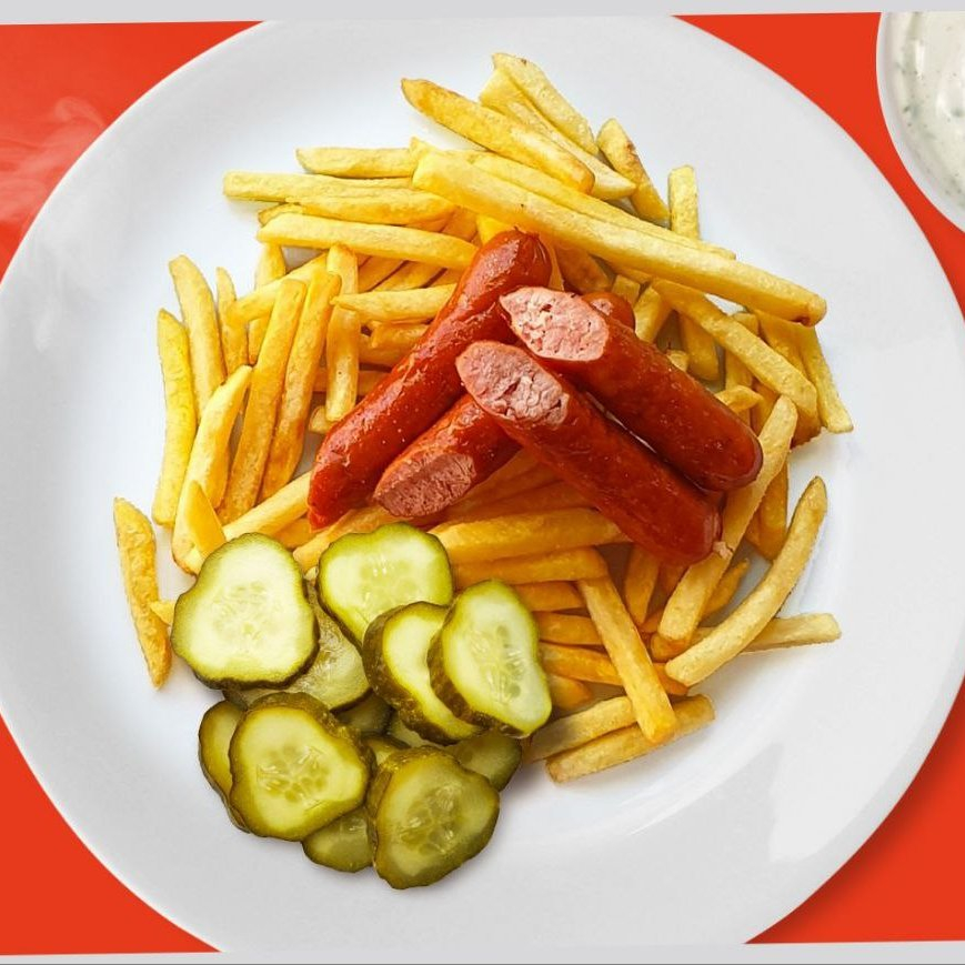 Заказать Охотничьи колбаски, картошка фри, солёный огурчик, чесночный соус.