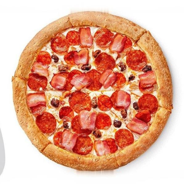 Основа - томатный соус, ветчина, салями, куриное филе, бекон, моцарелла.