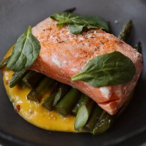 Форель со спаржей и соусом из манго