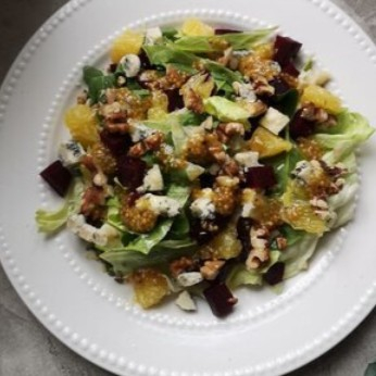 Салат айсберг, зелень свежая, свекла, апельсиновые сегменты, сыр дорблю, грецкий орех, заправка.