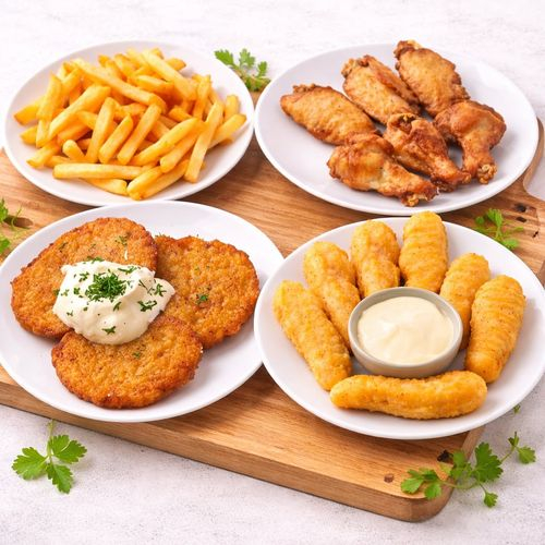 Драники со сметаной 3шт, картошка фри 150гр, куриные плечики 6шт, куриные стрипсы 7шт.
