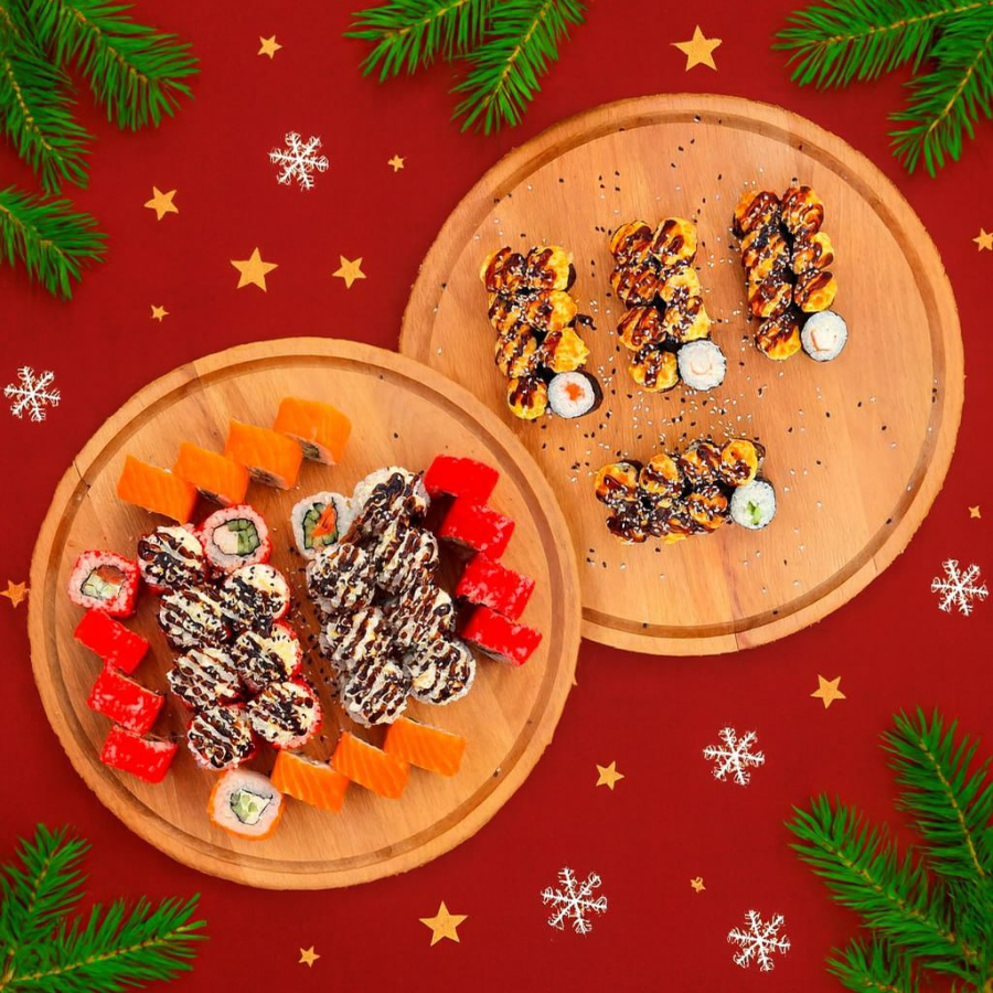 Запеченный маки с огурцом, запеченный маки с лососем, запеченный маки с креветка, Снежная Филадельфия с огурцом, Снежная калифорния с тунцом.