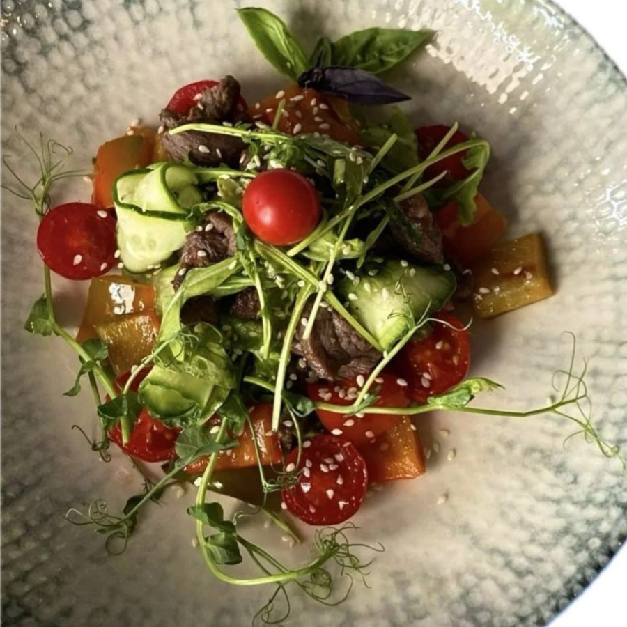 Заказать Салаты руккола и айсберг, говядина, перец, помидор, сочетание бальзамического уксуса и оливкового масла.