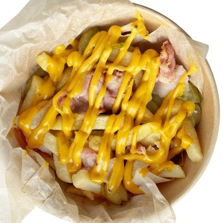 Картофель фри, бекон, огурец консервированный, топпинг горчичный, соус на выбор.