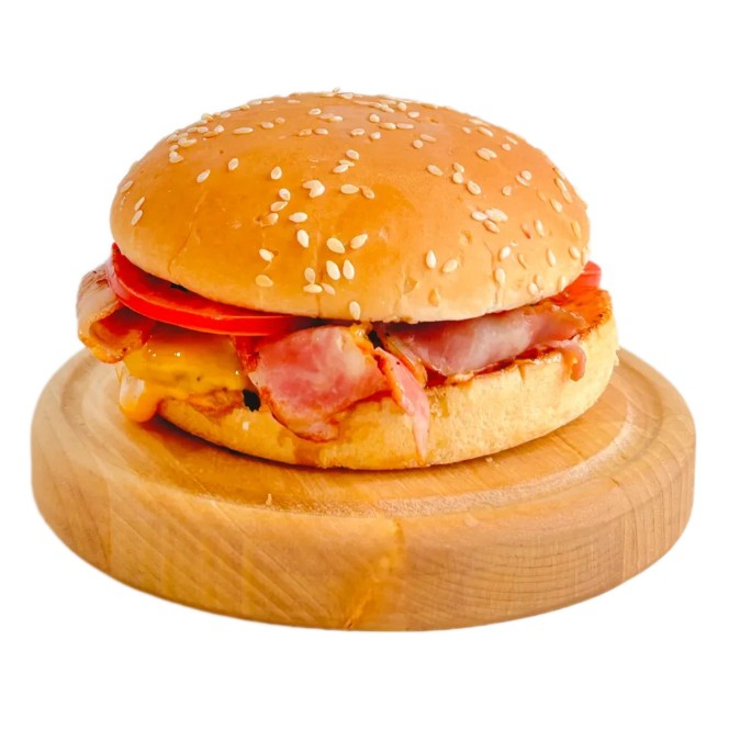 Заказать Говяжья котлета, бекон, томаты, маринованный лук, салат айсберг, сыр чеддер, соус для бургеров.