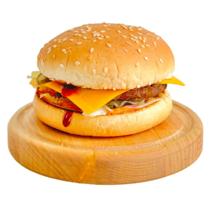 Говяжья котлета, консервированные огурцы, маринованный лук, сыр чеддер, соус для бургеров, кетчуп.