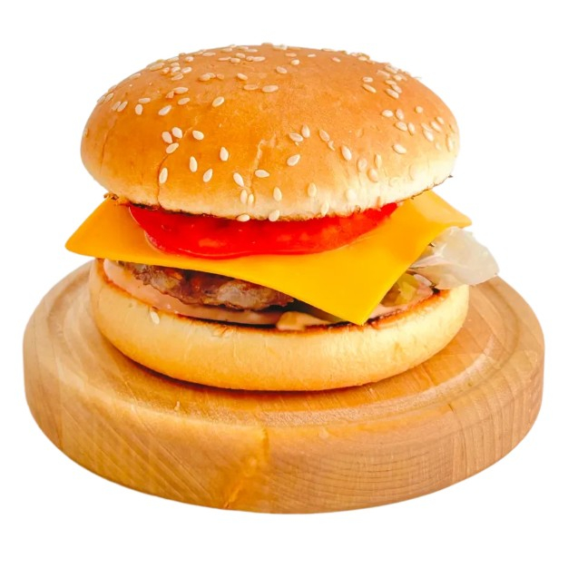 Говяжья котлета, консервированные огурцы, маринованный лук, салат айсберг, сыр чеддер, соус для бургеров, соус барбекю.