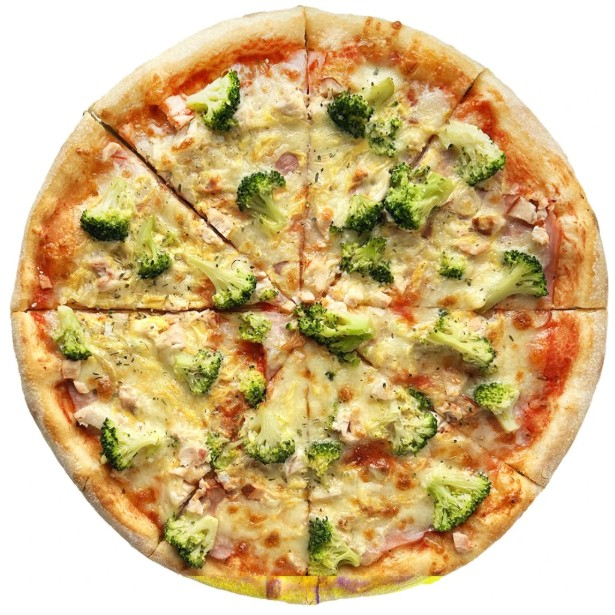 Соус фирменный, ветчина, курица, сыр моцарелла, яйцо, брокколи, орегано.