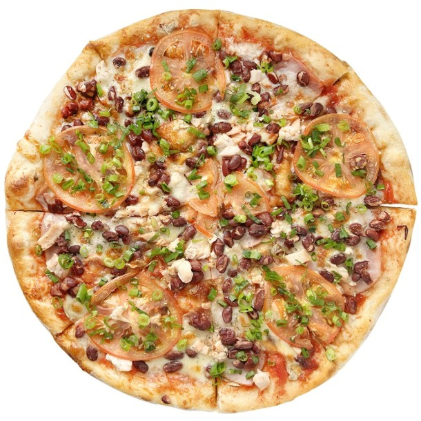 Соус фирменный, шампиньоны, ветчина, курица, сыр моцарелла, фасоль консервированная, помидоры, лук зеленый, орегано.