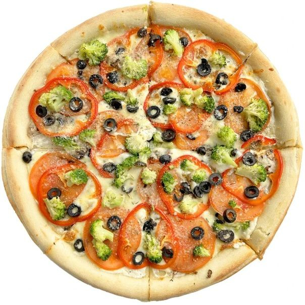 Соус Сметанный с грибами, шампиньоны, сыр Моцарелла, помидоры, перец сладкий, брокколи, маслины консервированные, сыр Пармезан, орегано.