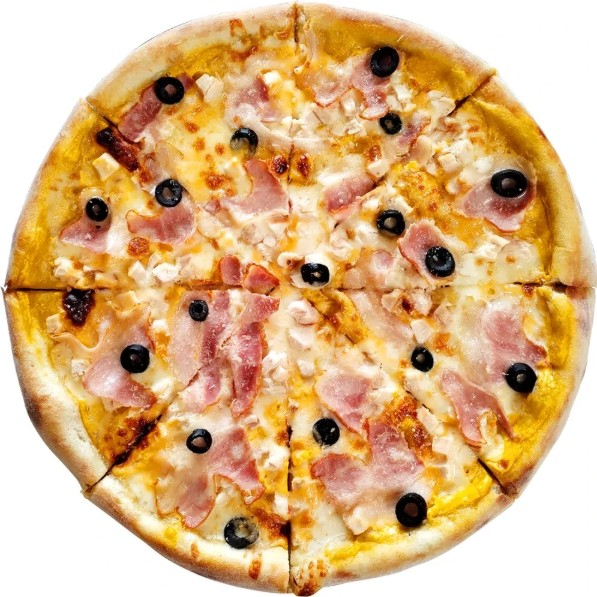 Соус сырный, сыр моцарелла, курица, бекон, сыр чеддер, сыр пармезан, маслины, орегано.
