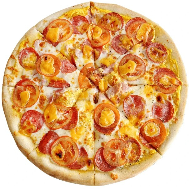 Соус сырный, ветчина, сыр моцарелла, салями, помидоры, сыр чеддер, орегано.