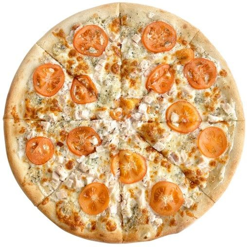 Соус сметанный с грибами, сыр моцарелла, курица, сыр с голубой плесенью, помидоры, орегано.