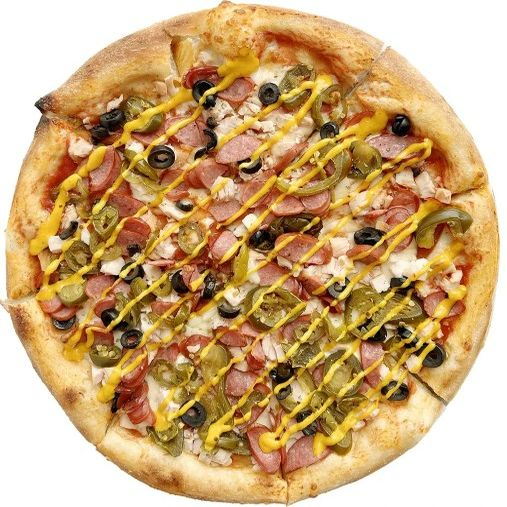 Соус фирменный, курица, сыр Моцарелла, колбаски охотничьи, маслины, перец халапеньо маринованный, соус Горчичный, орегано.