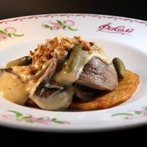Обжаренные ломтики говяжьего языка с драниками и сливочным грибным соусом.