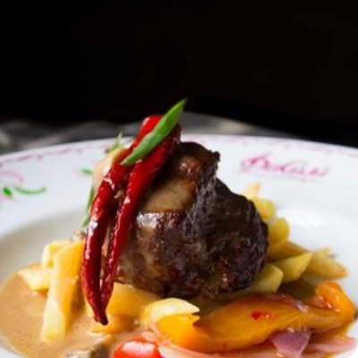 Стейк, говяжья вырезка, картофель фри, мясной соус Демиглас, грибы.