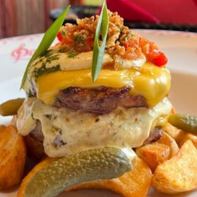 Рубленая говяжья вырезка, плавленный сыр чеддер, соус тартар, томатно-перечное конкассе, картофельные дольки.