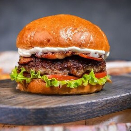Заказать Булочка, говяжий фарш, лук, салат айсберг, маринованный огурчик, сыр, бургер-соус.
