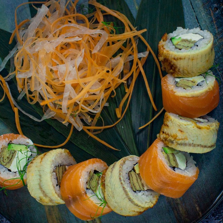 Рис, нори, сыр Филадельфия, угорь, салат Айсберг, авокадо, икра Тобико черная.