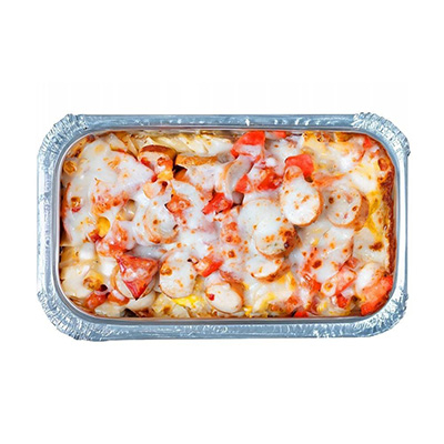 Паста, соус чесночный, сыр моцарелла, креветка коктейльная, томат.