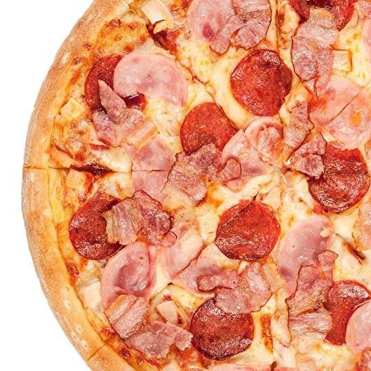 Основа: Томатный соус. Сыр моцарелла, цыпленок, ветчина, пепперони, бекон, базилик.