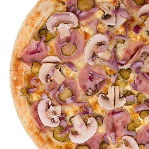 Основа: Ранч соус. Сыр моцарелла, ветчина, шампиньоны, маринованные огурцы, лук, базилик. Тесто на выбор.
