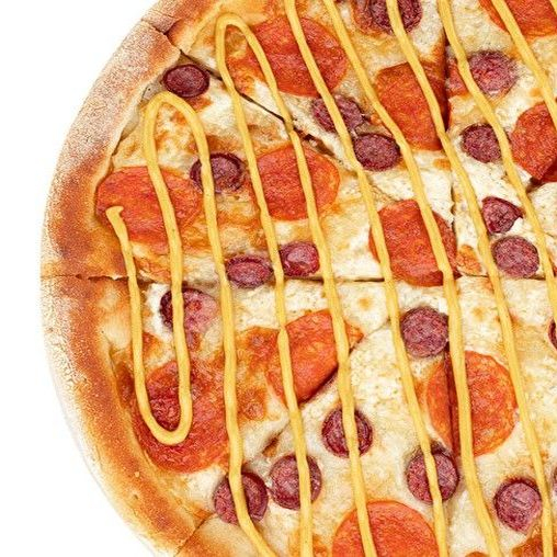 Основа: Томатный соус. Сыр моцарелла, пепперони, соус сырный, базилик. Тесто на выбор.