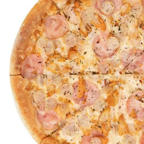 Заказать Основа: Чесночный соус. Сыр моцарелла, колбаски мюнхенские, цыпленок, ветчина, базилик. Тесто на выбор.
