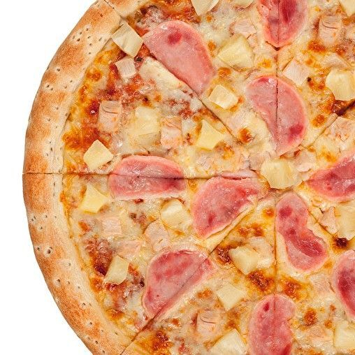 Основа: Томатный соус. Сыр, моцарелла, цыпленок, ветчина, ананас, базилик. Тесто на выбор.
