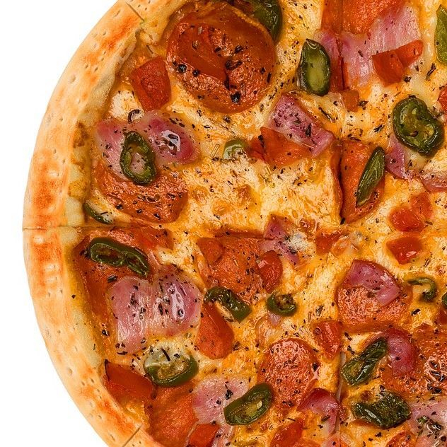 Основа: Спайси соус. Сыр моцарелла, пепперони, бекон, томаты, перец халапеньо, базилик. Тесто на выбор.