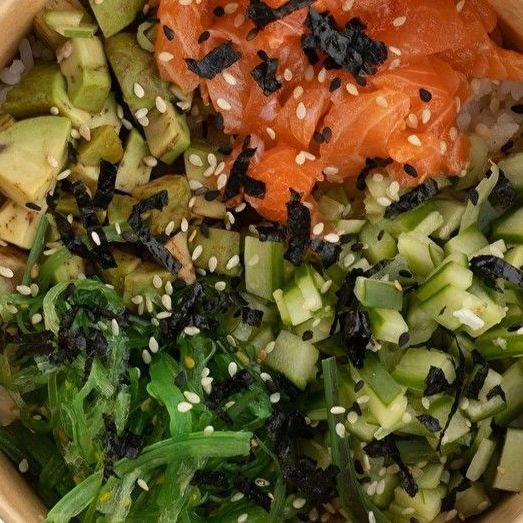 Заказать Рис, соус кунжутный, соус унаги, дайкон, тунец, авокадо, салат чука, кунжут, нори.