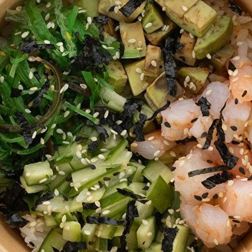 Заказать Рис, соус кунжутный, соус чили, огурец, креветка, авокадо, салат чука, кунжут, нори.