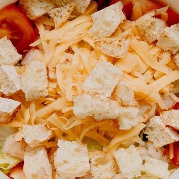 Салат айсберг, курица, томат черри, сыр пармезан, сухарики, дип пот соус цезарь.