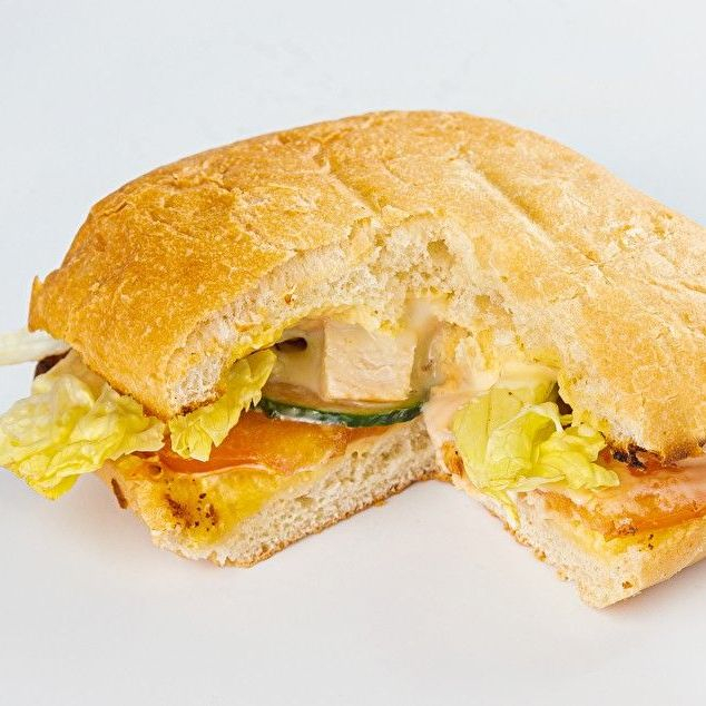 Заказать Чиабатта, курица, плавленый сыр, томат, салат латук, огурец свежий, сырный соус.